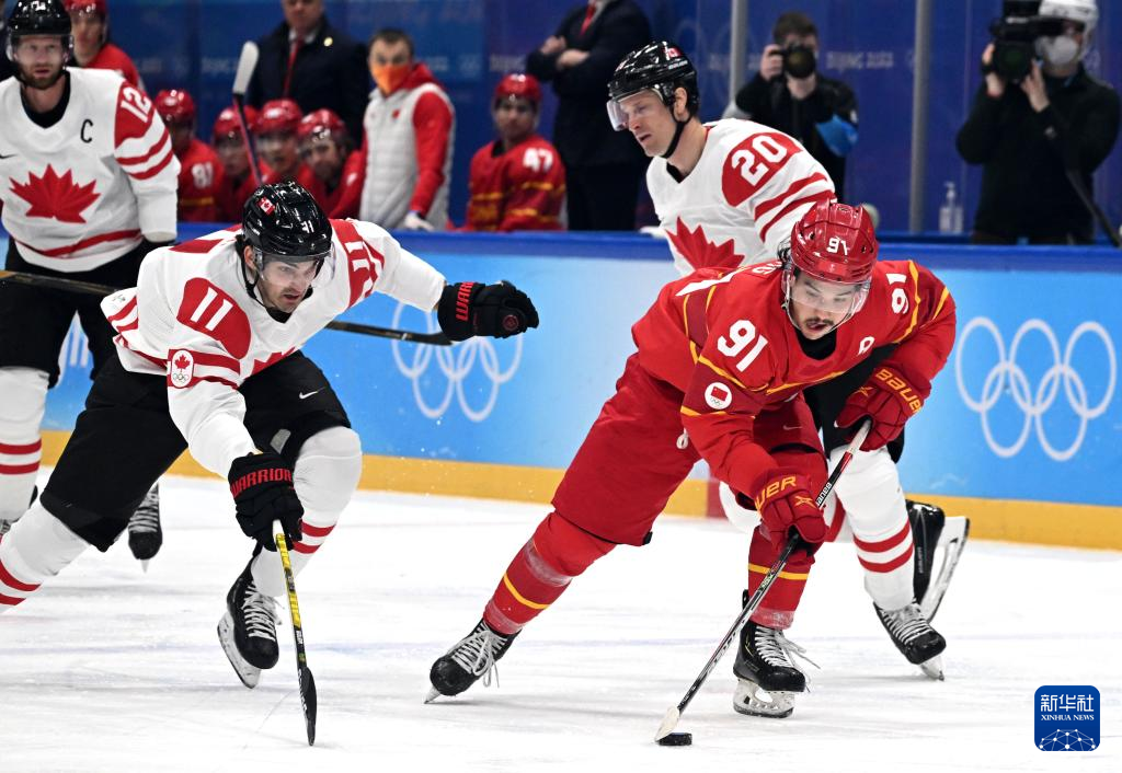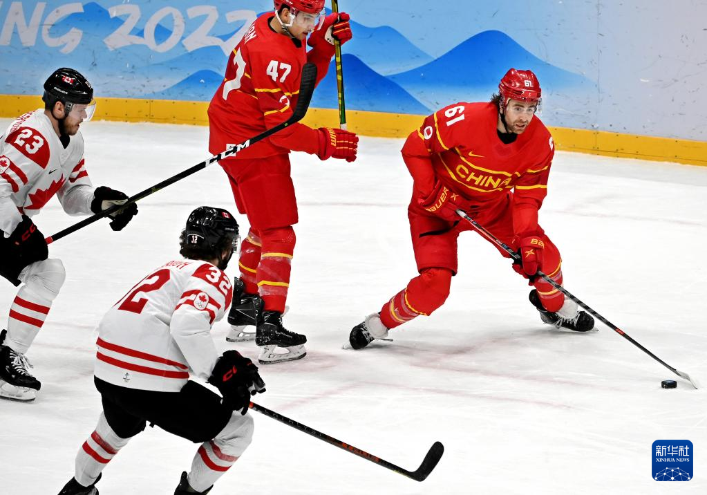 Luo Jia (2nd R) of China vies for the puck during the ice hockey men's preliminary round Group A match between China and Canada at National Indoor Stadium in Beijing, capital of China, Feb. 13, 2022. (Xinhua/Du Yu)