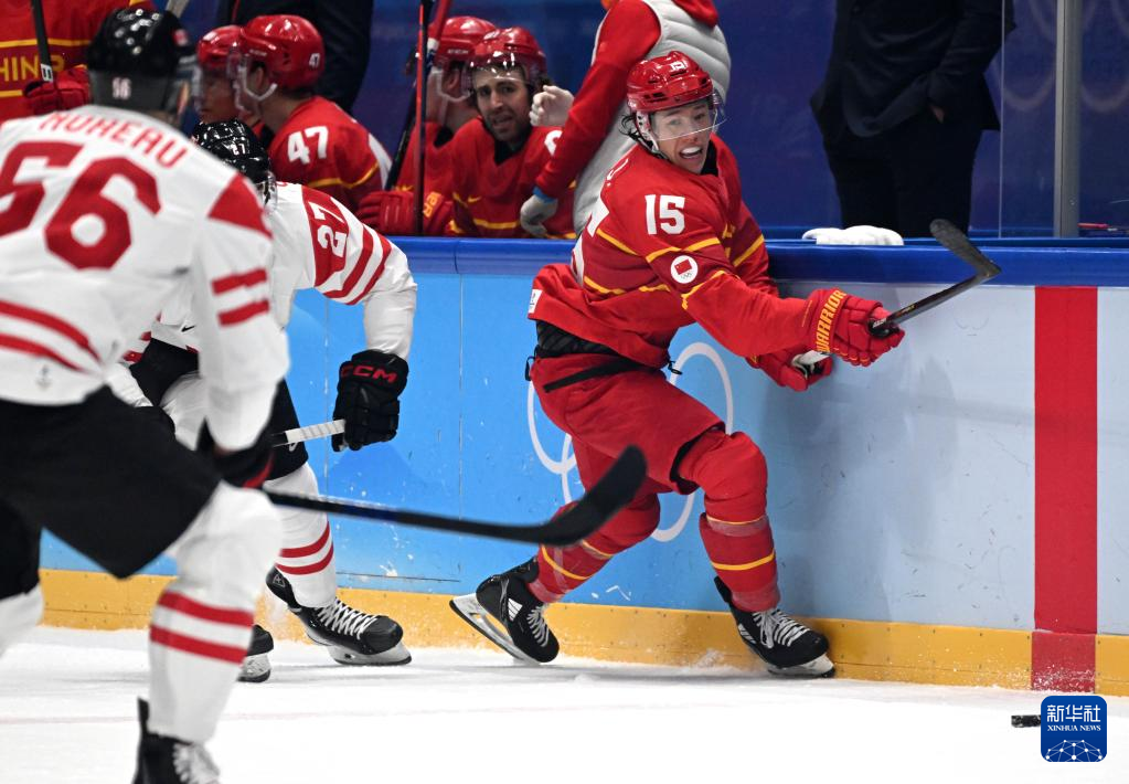 Fu Shuai (R) of China competes during the ice hockey men's preliminary round Group A match between China and Canada at National Indoor Stadium in Beijing, capital of China, Feb. 13, 2022. (Xinhua/Du Yu)
