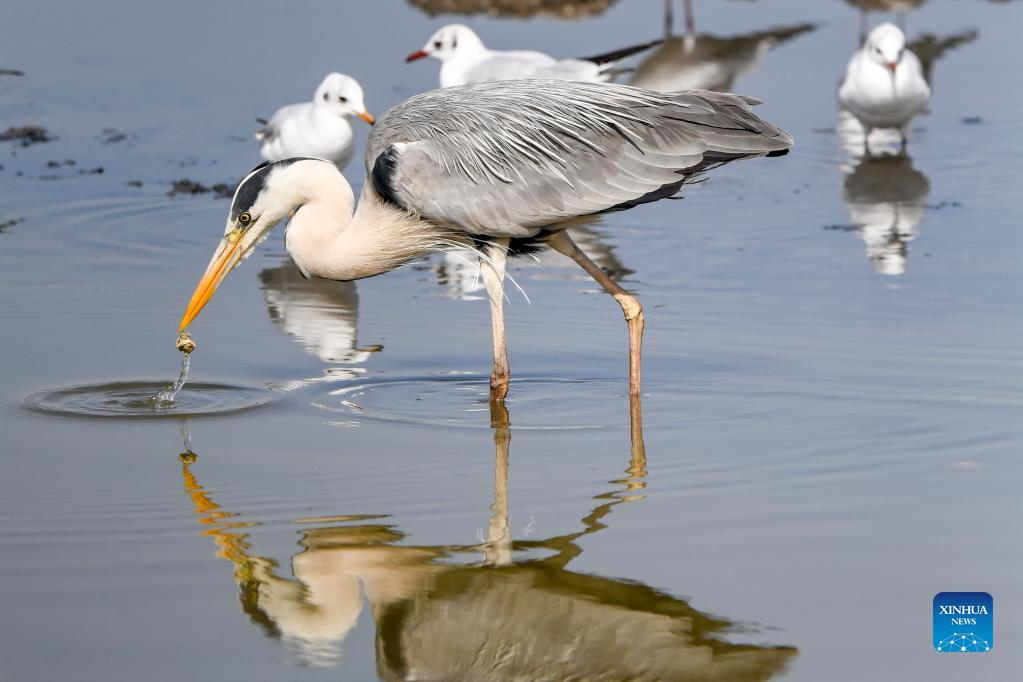 Birds forage at a beach in Jahra Governorate, Kuwait, Feb. 12, 2022. (Photo by Ghazy Qaffaf/Xinhua)