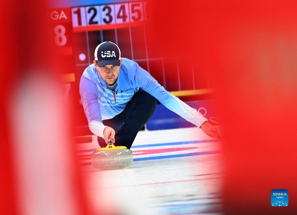 John Shuster (C) of the United States competes during the curling men's round robin session 7 of the Beijing 2022 Winter Olympics between China and the United States at National Aquatics Centre in Beijing, capital of China, Feb. 13, 2022. (Xinhua/Li He)