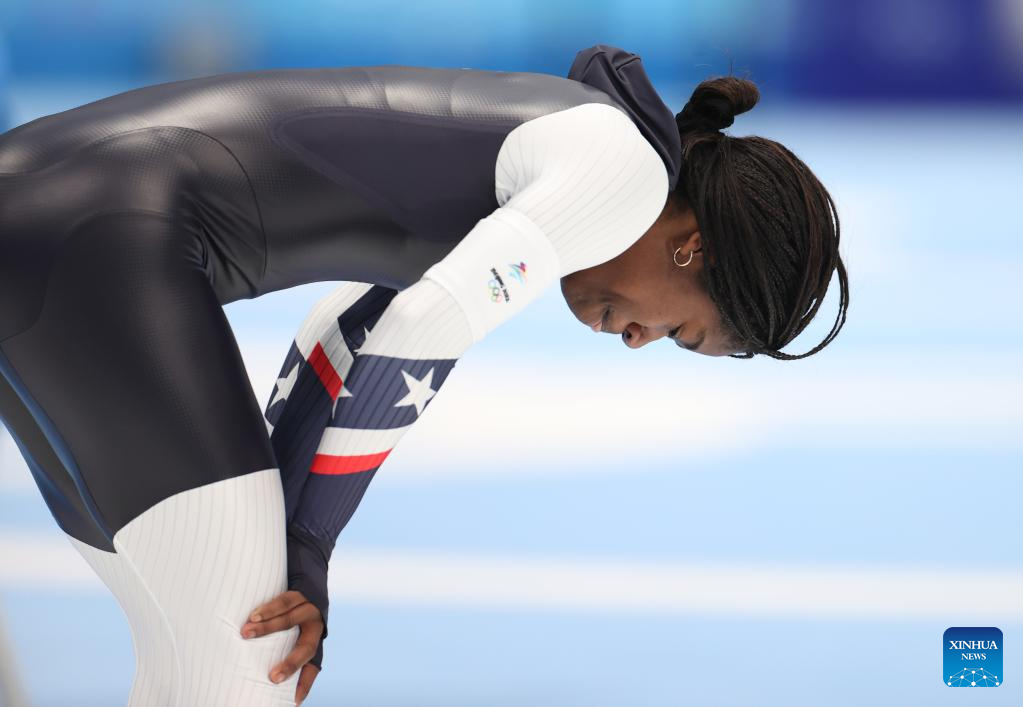 Erin Jackson of the United States reacts after speed skating women's 500m at the National Speed Skating Oval in Beijing, capital of China, Feb. 13, 2022. (Xinhua/Ding Xu)