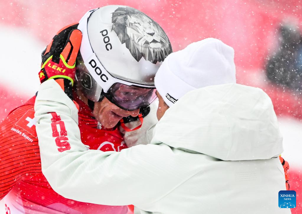 Marco Odermatt (L) of Switzerland celebrates with his coach after the alpine skiing men's giant slalom at National Alpine Skiing Centre in Yanqing District, Beijing, capital of China, Feb. 13, 2022. (Xinhua/Lian Zhen)