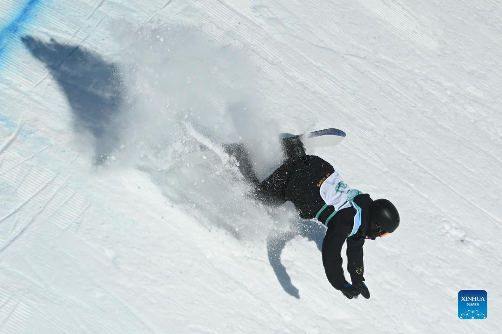 Rong Ge of China falls during women's snowboard big air qualification of Beijing 2022 Winter Olympics at Big Air Shougang in Beijing, capital of China, Feb. 14, 2021. (Xinhua/Huang Zongzhi)