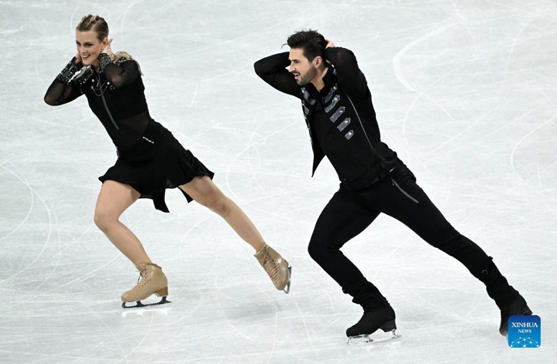Olivia Smart (L) and Adrian Diaz of Spain perform during the figure skating ice dance rhythm dance at Capital Indoor Stadium in Beijing, capital of China, Feb. 12, 2022. (Xinhua/Ma Ning)