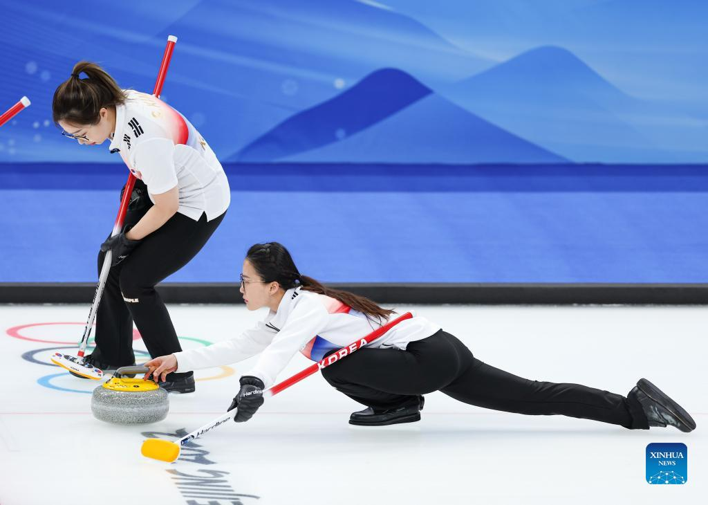 Kim Chohi (R) and Kim Seonyeong of South Korea compete during the curling women's round robin session 7 of Beijing Winter Olympics between the United States and South Korea at National Aquatics Centre in Beijing, capital of China, Feb. 14, 2022. (Xinhua/Wang Jingqiang)