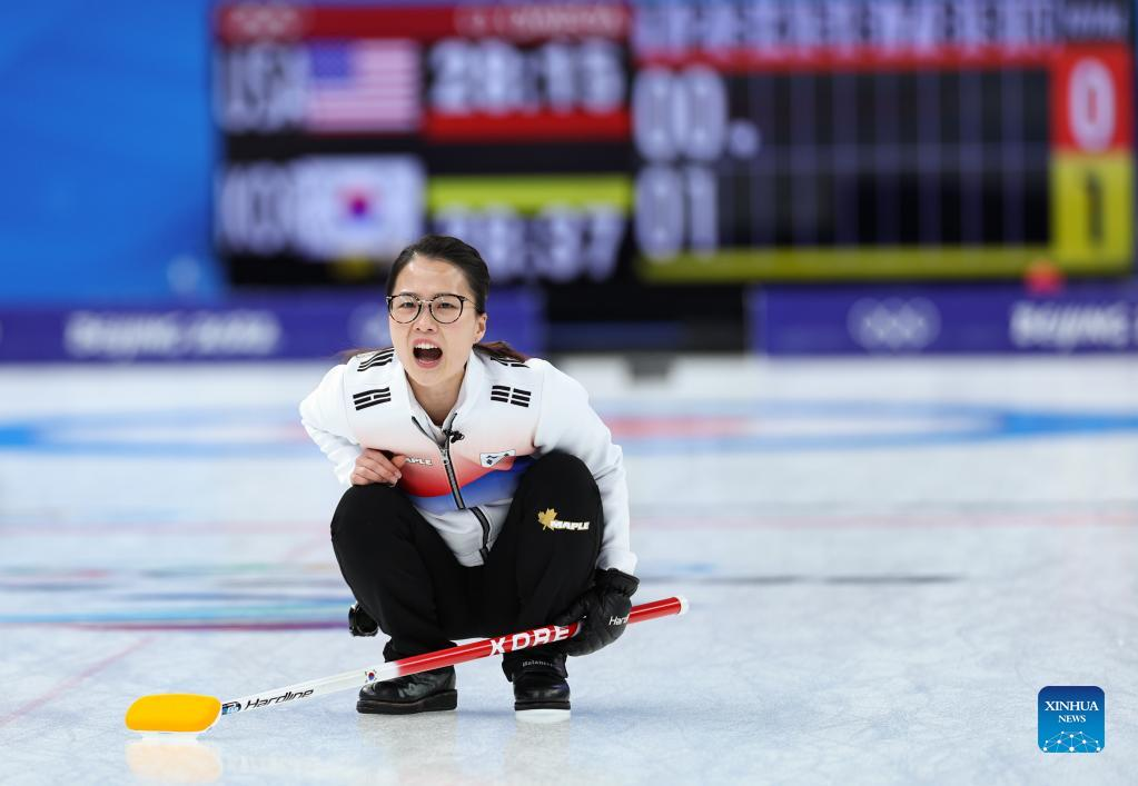 South Korea's Kim Eunjung competes during the curling women's round robin session 7 of Beijing Winter Olympics between the United States and South Korea at National Aquatics Centre in Beijing, capital of China, Feb. 14, 2022. (Xinhua/Wang Jingqiang)