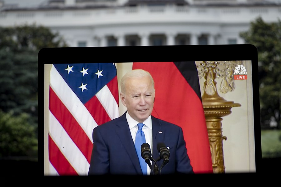 Photo taken in Arlington of Virginia, the United States, shows a screen displaying U.S. President Joe Biden and German Chancellor Olaf Scholz (not pictured) attending a press conference at the White House in Washington, D.C. Feb. 7, 2022. (Xinhua/Liu Jie)