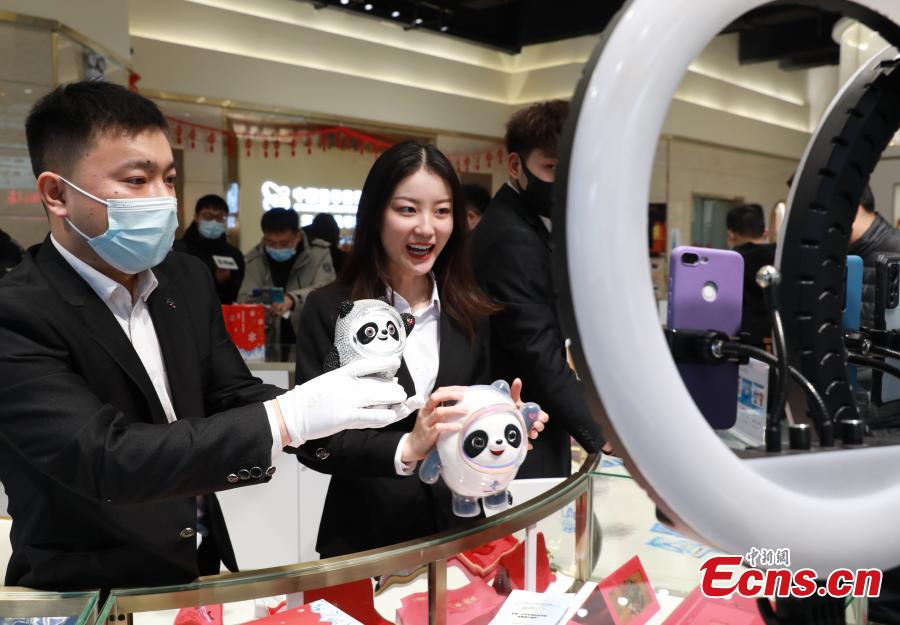 Staff members introduce the diamond-encrusted Bing Dwen Dwen, mascot of Beijing 2022 Winter Olympics to netizens in Zhengzhou, Central China's Henan Province, Feb. 14, 2022.