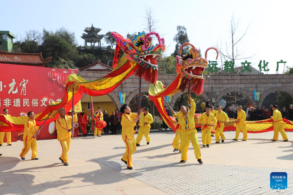 People perform dragon dance to celebrate the upcoming Lantern Festival in Wenling, east China's Zhejiang Province, Feb. 14, 2022. The Lantern Festival, the 15th day of the first month of the Chinese lunar calendar, falls on Feb. 15 this year. (Photo by Jiang Wenhui/Xinhua)