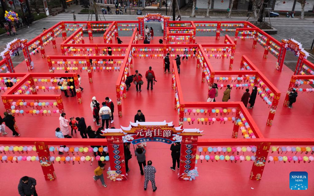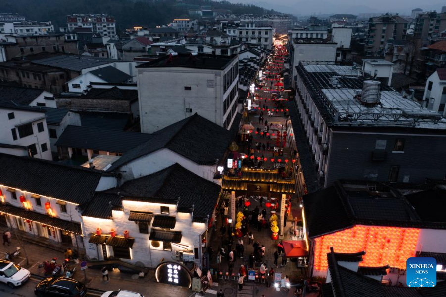 Aerial photo taken on Feb. 14, 2022 shows residents taking part in a riddle guessing activity to celebrate the upcoming Lantern Festival in the ancient town of Shouchang in Jiande, east China's Zhejiang Province. (Xinhua/Xu Yu)