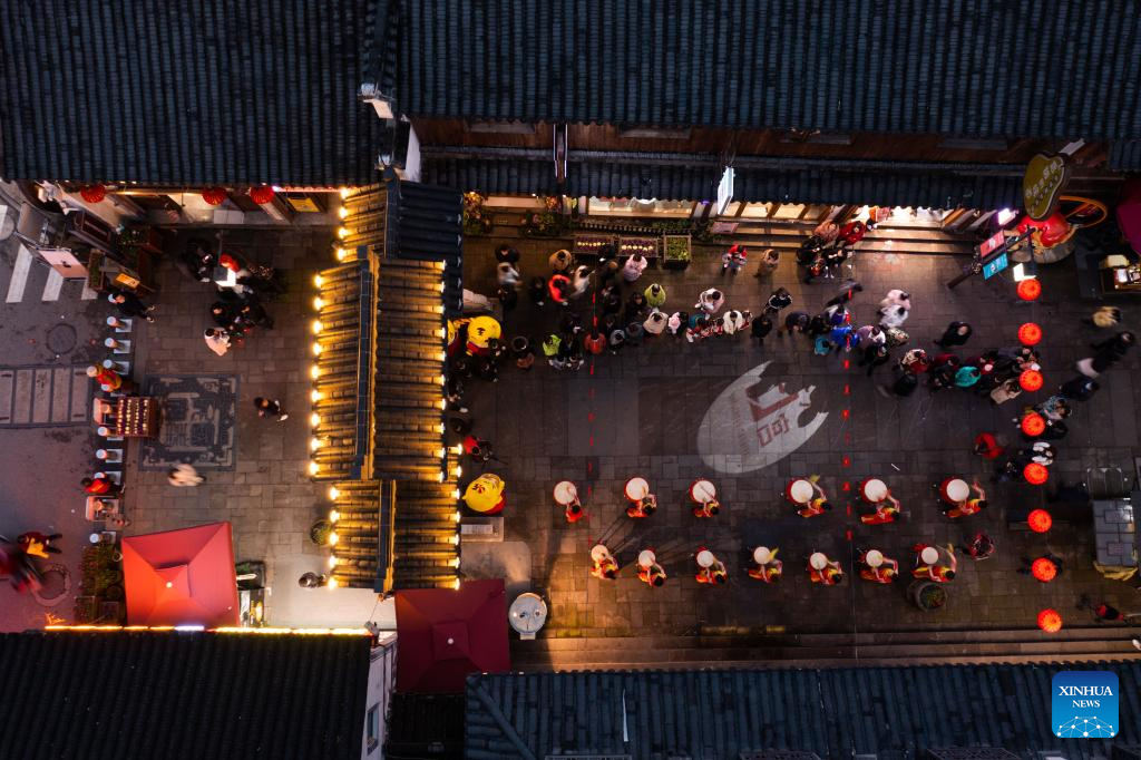 Aerial photo taken on Feb. 14, 2022 shows people watching dragon dance to celebrate the upcoming Lantern Festival in the ancient town of Shouchang in Jiande, east China's Zhejiang Province. (Xinhua/Xu Yu)