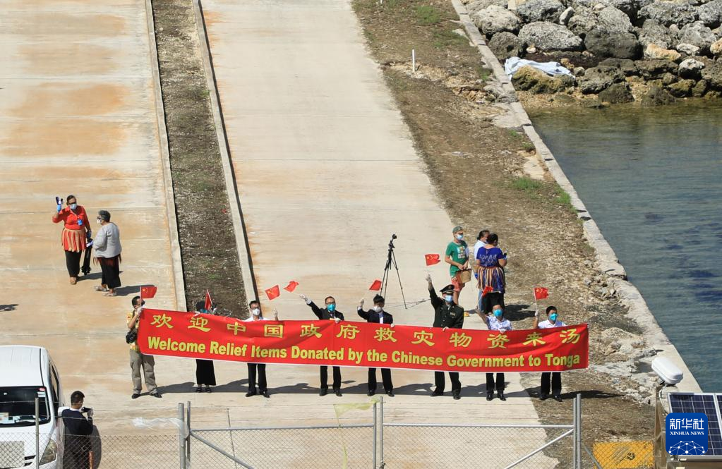 Staff members of Chinese Embassy in Tonga welcome a flotilla of the People's Liberation Army (PLA) Navy delivering relief supplies at a port in Nuku' alofa, Tonga, Feb. 15, 2022. (Photo by Xue Chengqing/Xinhua)