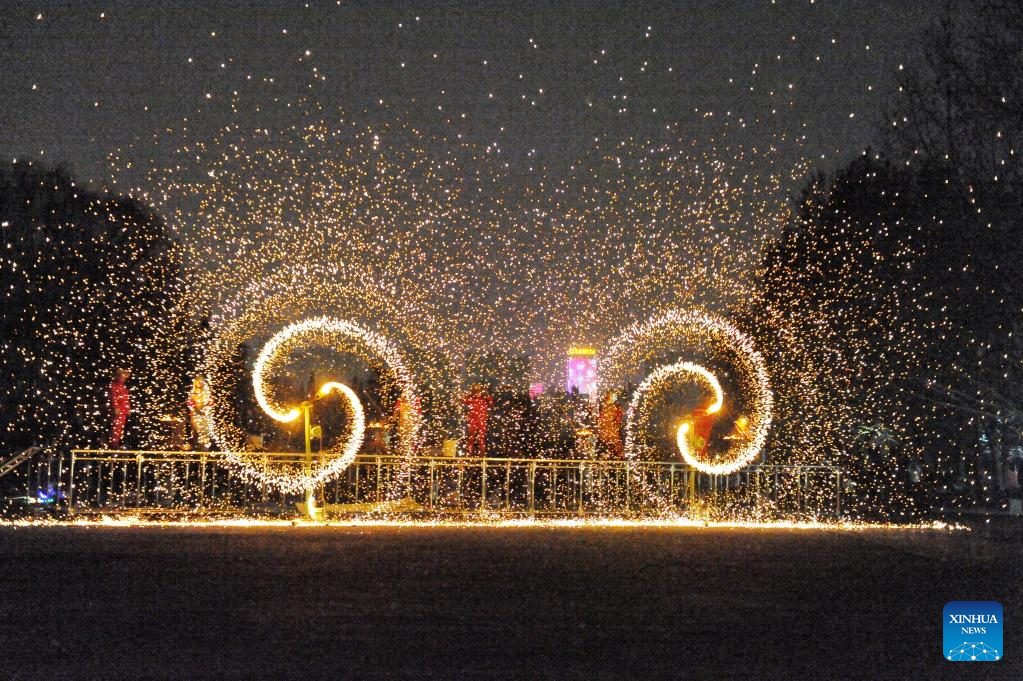 Performers throw molten iron to create fireworks to celebrate the Lantern Festival, in Luoyang, central China's Henan Province, Feb. 14, 2022. The Lantern Festival, the 15th day of the first month of the Chinese lunar calendar, falls on Feb. 15 this year. (Xinhua/Han Chaoyang)