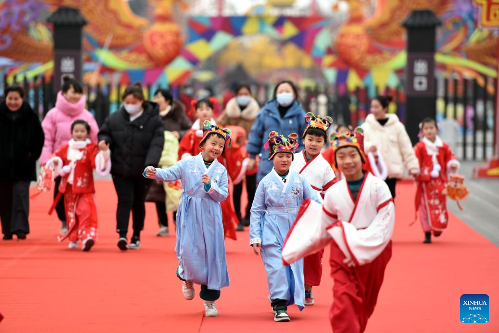Children visit a lantern fair to celebrate the Lantern Festival in Linyi City, east China's Shandong Province, Feb. 15, 2022. The Lantern Festival, the 15th day of the first month of the Chinese lunar calendar, falls on Feb. 15 this year. (Photo by Fang Dehua/Xinhua)
