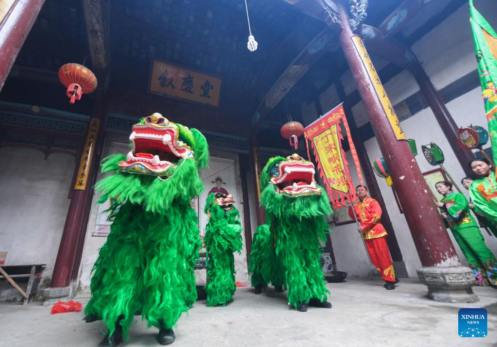 People perform lion dance to celebrate the Lantern Festival in Weiyuan County of Dingxi, northwest China's Gansu Province, Feb. 15, 2022. The Lantern Festival, the 15th day of the first month of the Chinese lunar calendar, falls on Feb. 15 this year. (Xinhua/Ma Xiping)