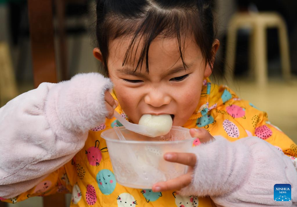 A child eats glutinous rice balls in Huzhou, east China's Zhejiang Province, Feb. 15, 2022. The Lantern Festival, the 15th day of the first month of the Chinese lunar calendar, falls on Feb. 15 this year. (Xinhua/Weng Xinyang)