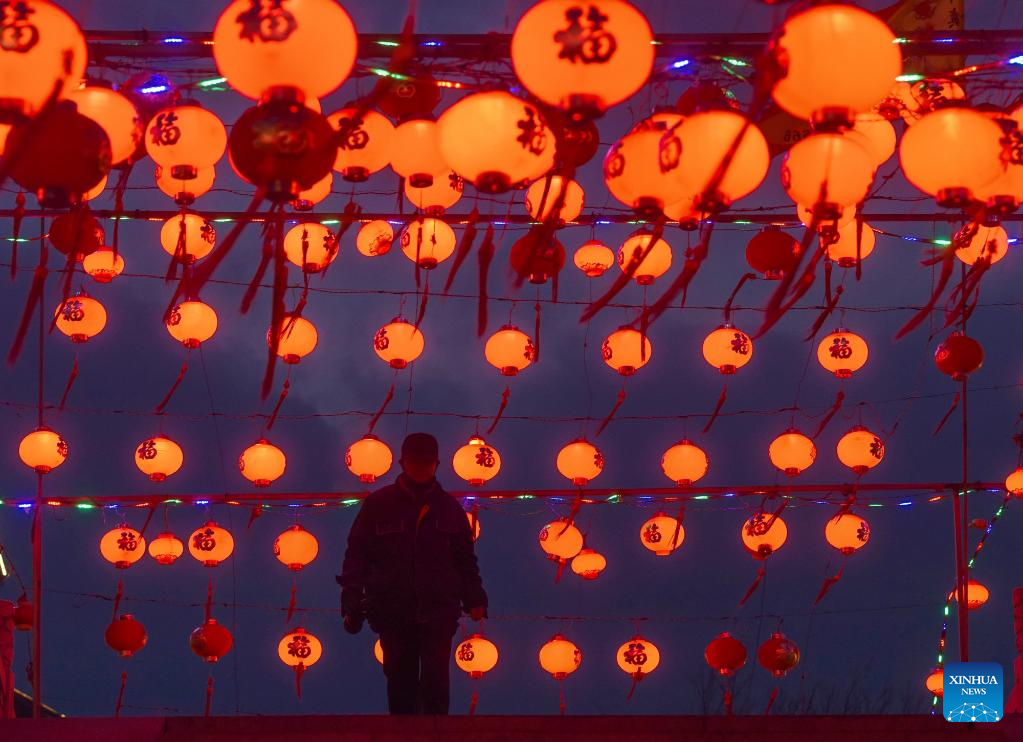 A man visits a lantern fair to celebrate the Lantern Festival in Jiaozhou City, east China's Shandong Province, Feb. 14, 2022. The Lantern Festival, the 15th day of the first month of the Chinese lunar calendar, falls on Feb. 15 this year. (Photo by Wang Zhaomai/Xinhua)