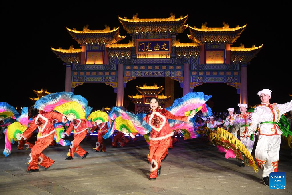 Performers dance to celebrate the Lantern Festival, in Yanchi County, northwest China's Ningxia Hui Autonomous Region, Feb. 14, 2022. The Lantern Festival, the 15th day of the first month of the Chinese lunar calendar, falls on Feb. 15 this year. (Xinhua/Wang Peng)