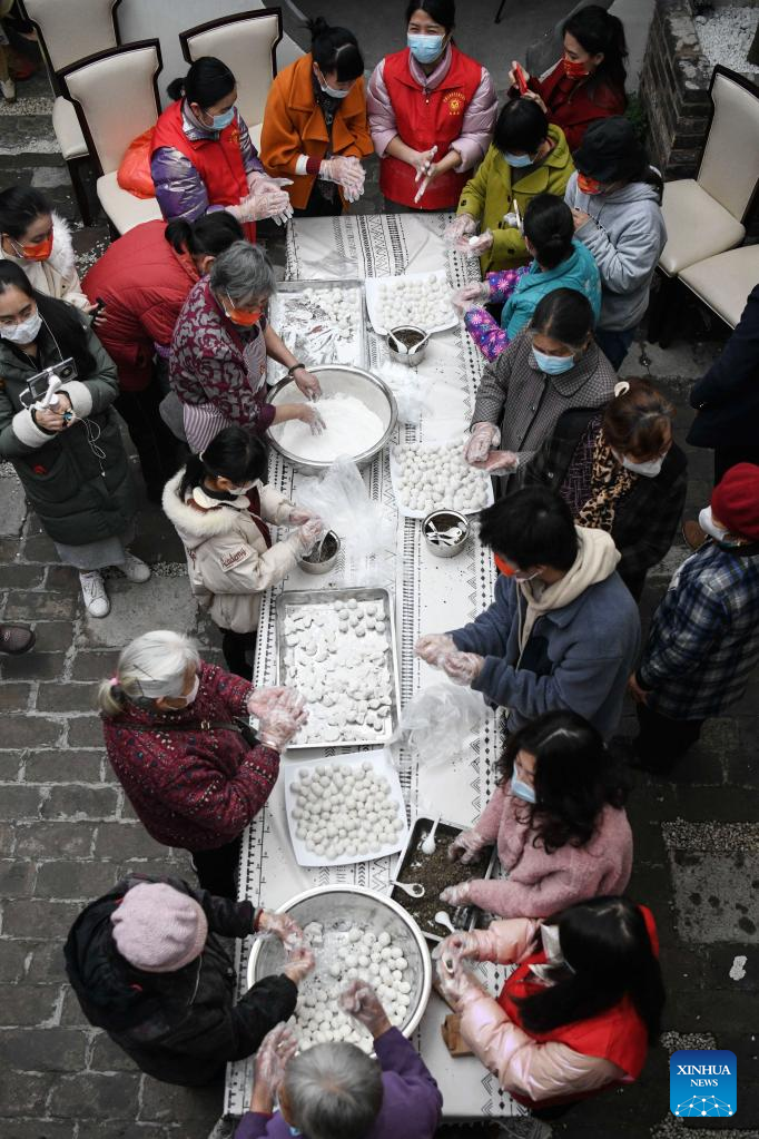 Overseas students make glutinous rice balls with community volunteers to celebrate the Lantern Festival, in Beijing, capital of China, Feb. 15, 2022. The Lantern Festival, the 15th day of the first month of the Chinese lunar calendar, falls on Feb. 15 this year. (Xinhua/Ren Chao)
