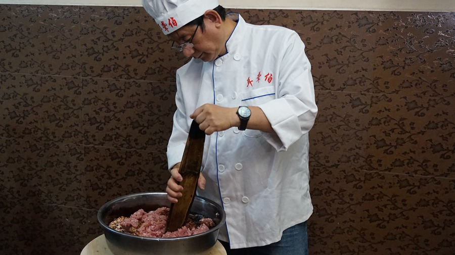 Lin Yingde makes meat stuffing for his restaurant’s special glutinous rice balls. (Photo/Lin Wei)