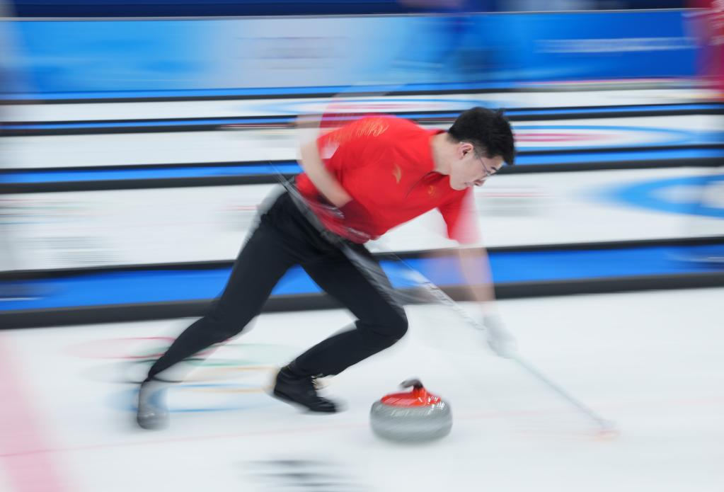 Xu Jingtao of China competes during the curling men's round robin session 11 of Beijing 2022 Winter Olympics between China and Switzerland at National Aquatics Centre in Beijing, capital of China, Feb. 16, 2022. (Xinhua/Zhou Mi)