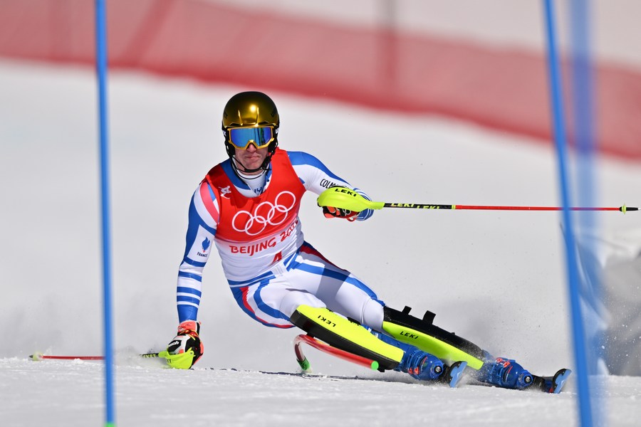 Clement Noel of France competes during alpine skiing men's slalom of Beijing 2022 Winter Olympics at National Alpine Skiing Centre in Yanqing, Beijing, capital of China, Feb. 16, 2022. (Xinhua/Chen Yichen)