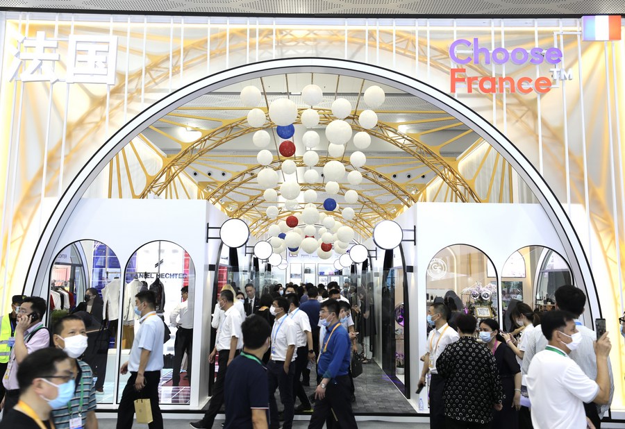 People visit the France Exhibition Area in the Fashion Life Exhibition Hall of the first China International Consumer Products Expo in Haikou, capital of south China's Hainan Province, May 7, 2021. (Xinhua/Jin Liwang)