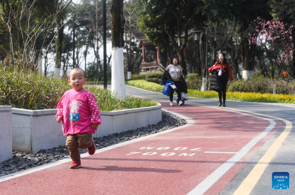 A child walks on a pavement at the former site of Chongqing Iron &Steel Factory in Dadukou District of southwest China's Chongqing Municipality, Feb. 15, 2022. The pavement is one of the 60 characteristic pavements planned by local authorities in the mountainous city of Chongqing. (Xinhua/Wang Quanchao)