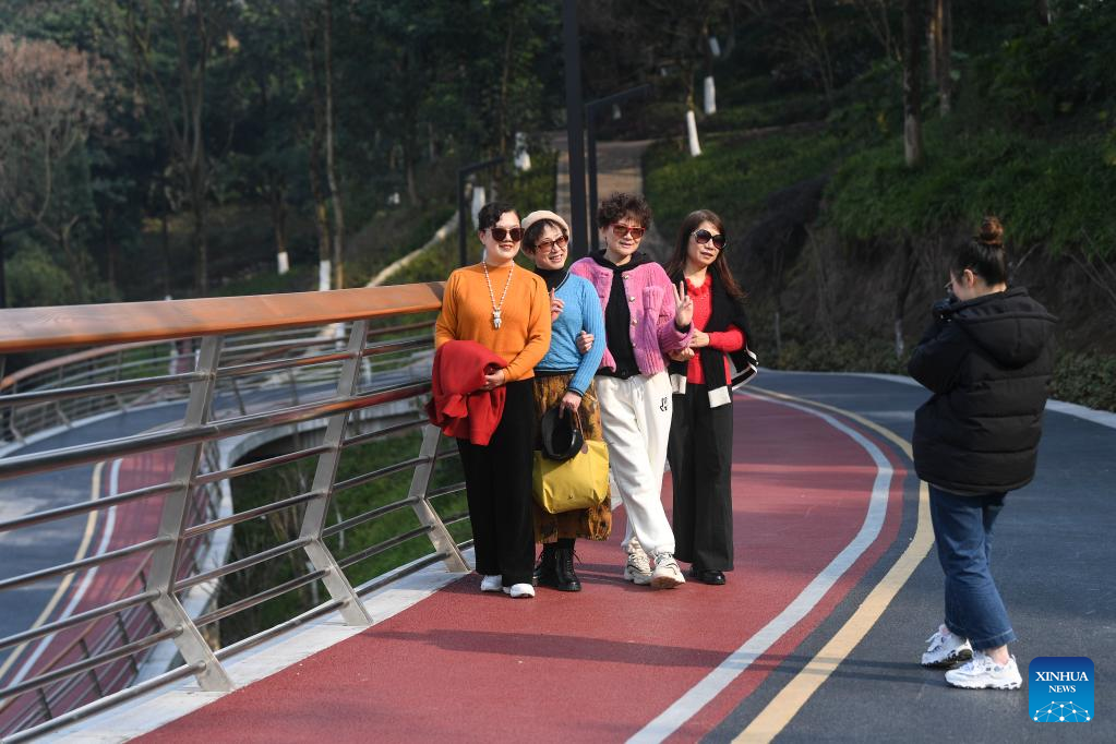 Aerial photo shows tourists walking on a pavement at the former site of Chongqing Iron &Steel Factory in Dadukou District of southwest China's Chongqing Municipality, Feb. 15, 2022. The pavement is one of the 60 characteristic pavements planned by local authorities in the mountainous city of Chongqing. (Xinhua/Wang Quanchao)