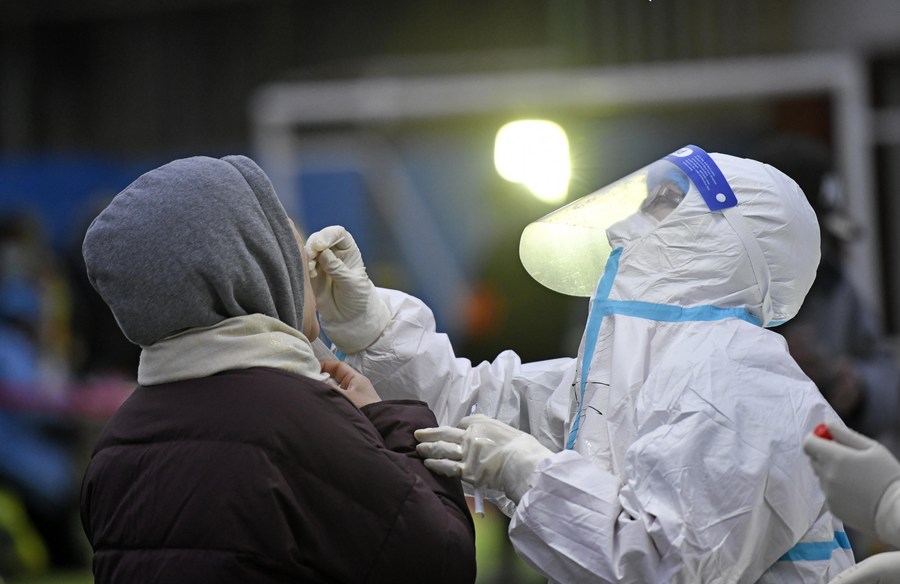 A medical worker takes a swab sample from a resident for nucleic acid test at a COVID-19 testing site in Hedong District in north China's Tianjin, Jan. 20, 2022. (Xinhua/Zhao Zishuo)