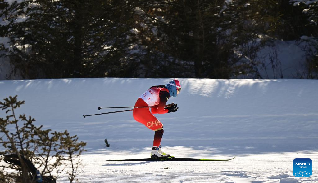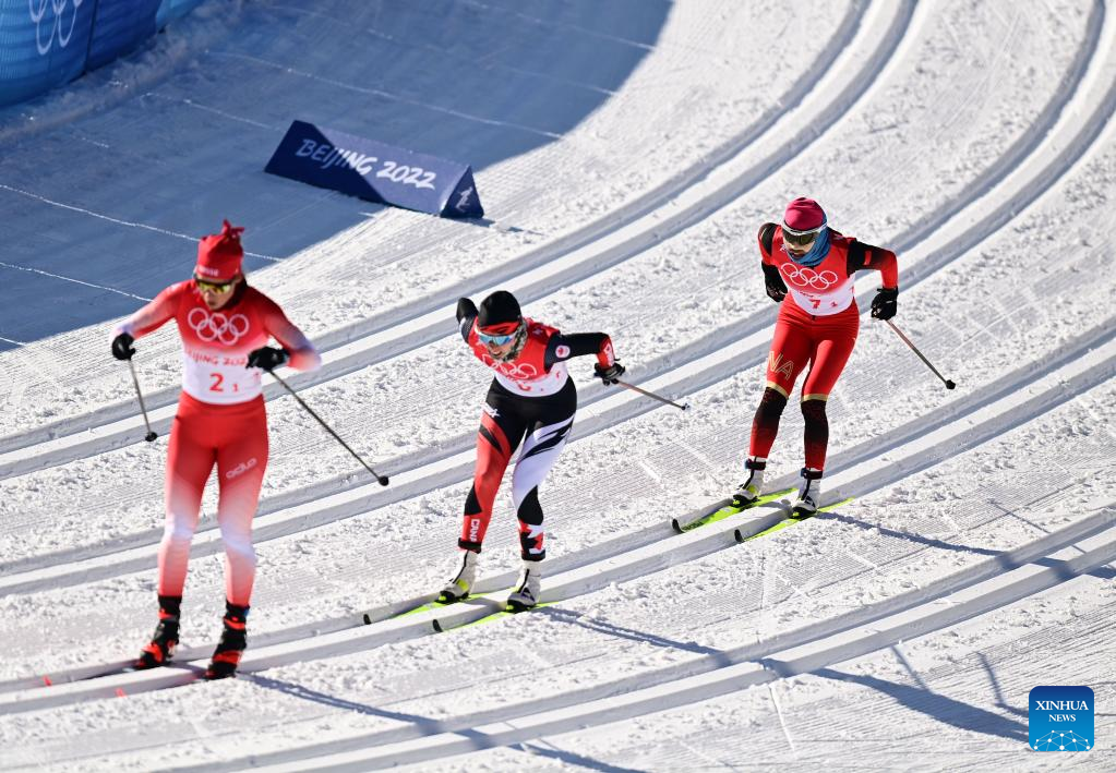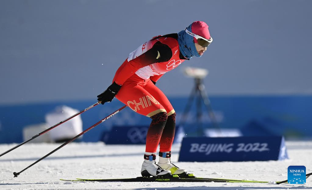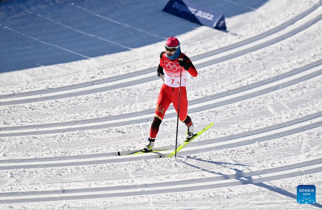 Li Xin of China crosses the finish line during the cross-country skiing women's team sprint classic semifinals of the Beijing Winter Olympics at National Cross-Country Skiing Centre in Zhangjiakou, north China's Hebei Province, Feb. 16, 2022. (Xinhua/Zhang Hongxiang)