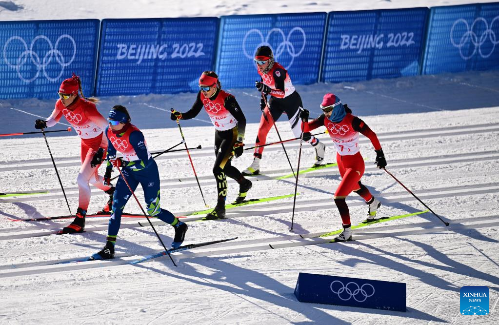 Chi Chunxue (1st R) of China competes during the cross-country skiing women's team sprint classic semifinals of the Beijing Winter Olympics at National Cross-Country Skiing Centre in Zhangjiakou, north China's Hebei Province, Feb. 16, 2022. (Xinhua/Zhang Hongxiang)