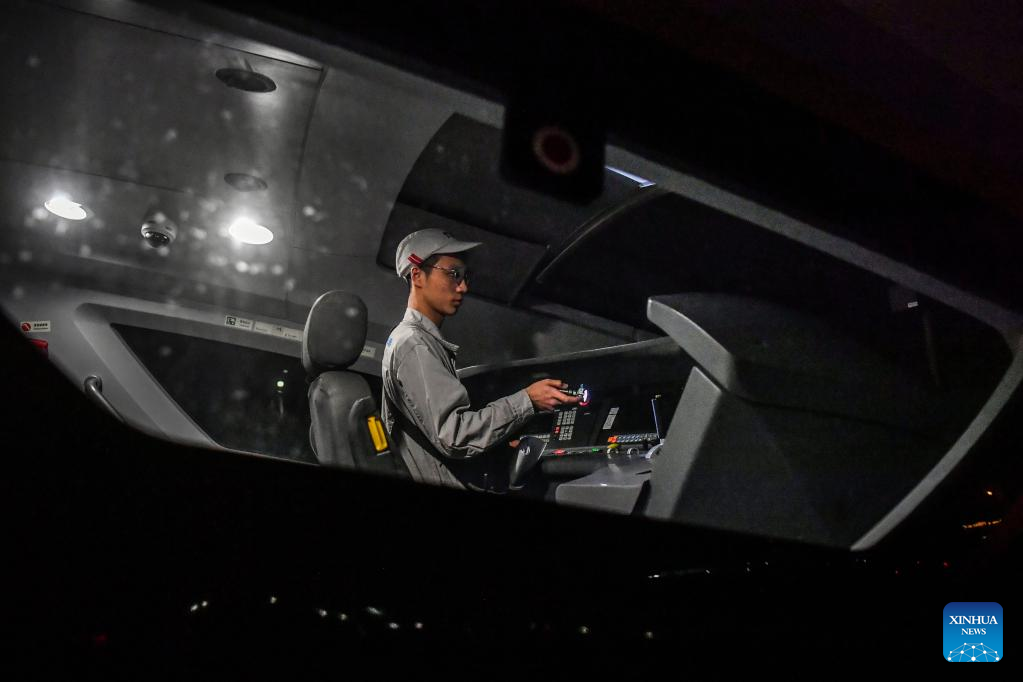 Wu Guohua, head of a maintenance team, inspects the pantograph of a bullet train in Taiyuan, north China's Shanxi Province, Feb. 16, 2022. In spite of the cold weather, a maintenance team under China Railway Taiyuan Group Co., Ltd. inspects over 70 different types of electric multiple unit (EMU) trains on a daily basis to ensure that local bullet trains run smoothly. (Xinhua/Cao Yang)