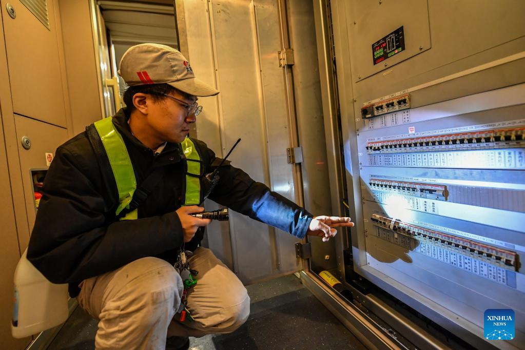 A railway mechanic inspects the power distribution cabinet on a bullet train in Taiyuan, north China's Shanxi Province, Feb. 16, 2022. In spite of the cold weather, a maintenance team under China Railway Taiyuan Group Co., Ltd. inspects over 70 different types of electric multiple unit (EMU) trains on a daily basis to ensure that local bullet trains run smoothly. (Xinhua/Cao Yang)