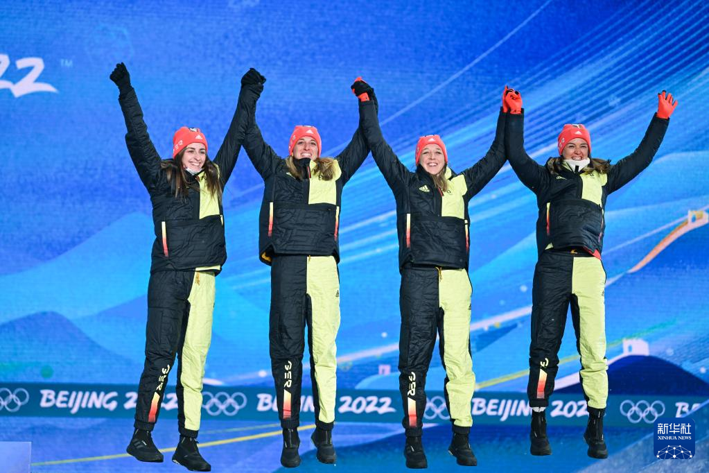 Bronze medalists of Germany pose during the awarding ceremony of biathlon women's 4x6km relay at Zhangjiakou Medals Plaza of the Winter Olympics in Zhangjiakou, north China's Hebei Province, Feb. 17, 2022. (Xinhua/Mu Yu)