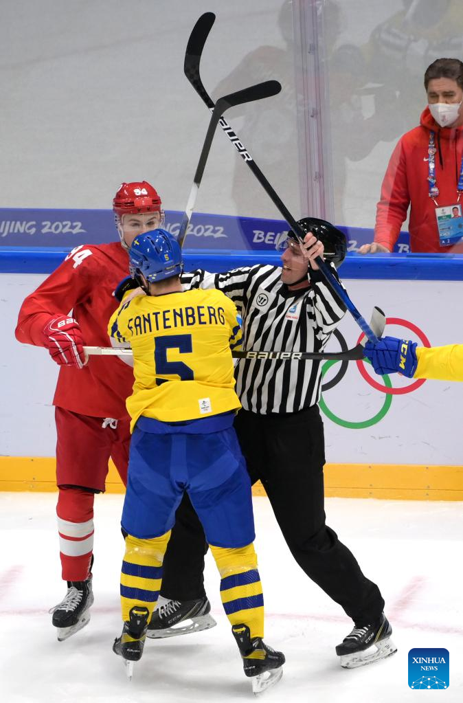 A fight breaks out during the ice hockey men's play-off semifinal of Beijing 2022 Winter Olympics between ROC and Sweden at National Indoor Stadium in Beijing, capital of China, Feb. 18, 2022. (Xinhua/Li An)