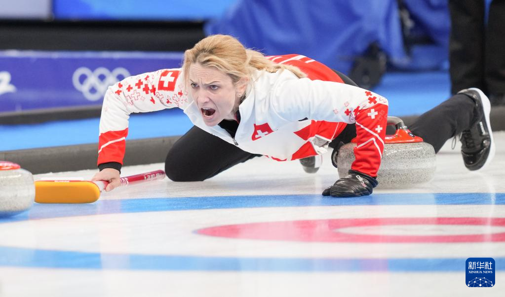 Silvana Tirinzoni of Switzerland competes during curling woman's semifinal of the Beijing 2022 Winter Olympics between Japan and Switzerland at the National Aquatics center in Beijing, China, Feb.18, 2022. (Xinhua/Zhou Mi)