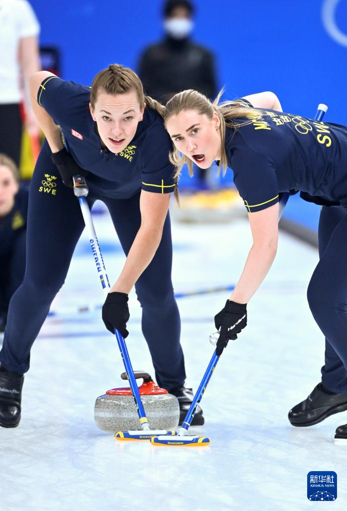 Athletes of Sweden compete during curling woman's semifinal of the Beijing 2022 Winter Olympics between Sweden and Britain at the National Aquatics center in Beijing, China, Feb.18, 2022. (Xinhua/Huang Xiaobang)