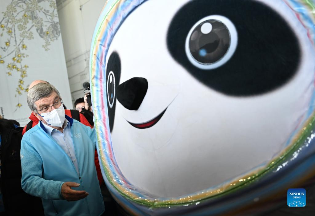 The International Olympic Committee President Thomas Bach interacts with Bing Dwen Dwen, the mascot for the Beijing 2022 Olympic Winter Games, at the Main Media Center for the Games in Beijing, capital of China, Feb. 18, 2022. (Xinhua/Li Yibo)