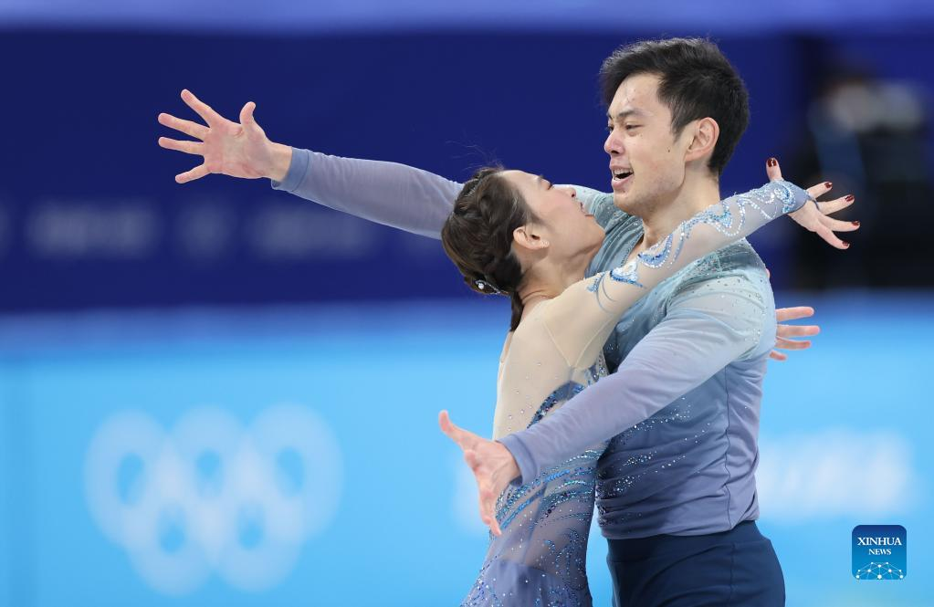Vanessa James(R)/Eric Radford of Canada perform during the figure skating pair skating short program at Capital Indoor Stadium in Beijing, capital of China, Feb. 18, 2022. (Xinhua/Cao Can)