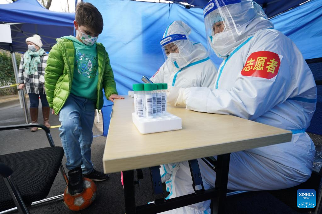 A foreign resident takes COVID-19 test at a COVID-19 testing site in the Suzhou Industrial Park in Suzhou, east China's Jiangsu Province, Feb. 18, 2022. The Suzhou Industrial Park launched its third round of COVID-19 nucleic acid testing on Friday. In order to facilitate foreigners living in the region to take COVID-19 tests, American volunteers Ellen Touchstone and Dinh Thang, together with other language volunteers, provided service at the COVID-19 testing site, helping fight against the latest COVID-19 resurgence in Suzhou. (Xinhua/Ji Chunpeng)