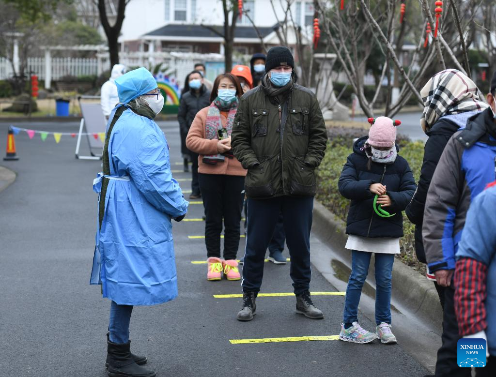 Ellen Touchstone (1st L) maintains order at a COVID-19 testing site in the Suzhou Industrial Park in Suzhou, east China's Jiangsu Province, Feb. 18, 2022. The Suzhou Industrial Park launched its third round of COVID-19 nucleic acid testing on Friday. In order to facilitate foreigners living in the region to take COVID-19 tests, American volunteers Ellen Touchstone and Dinh Thang, together with other language volunteers, provided service at the COVID-19 testing site, helping fight against the latest COVID-19 resurgence in Suzhou. (Xinhua/Ji Chunpeng)