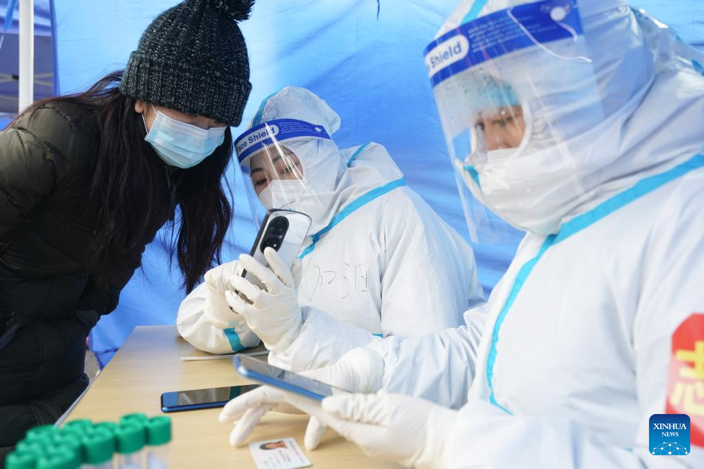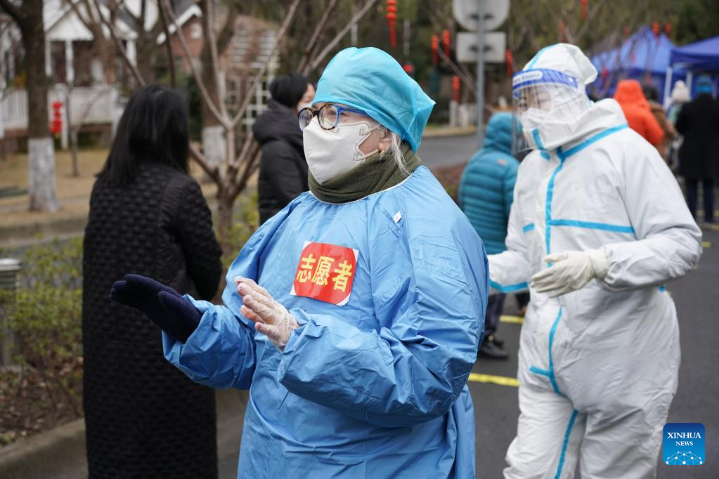 Volunteer Wu Qiong registers information for residents at a COVID-19 testing site in the Suzhou Industrial Park in Suzhou, east China's Jiangsu Province, Feb. 18, 2022. The Suzhou Industrial Park launched its third round of COVID-19 nucleic acid testing on Friday. In order to facilitate foreigners living in the region to take COVID-19 tests, American volunteers Ellen Touchstone and Dinh Thang, together with other language volunteers, provided service at the COVID-19 testing site, helping fight against the latest COVID-19 resurgence in Suzhou. (Xinhua/Ji Chunpeng)