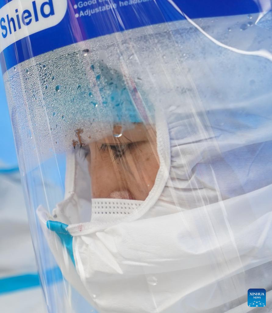Ellen Touchstone (front) works at a COVID-19 testing site in the Suzhou Industrial Park in Suzhou, east China's Jiangsu Province, Feb. 18, 2022. The Suzhou Industrial Park launched its third round of COVID-19 nucleic acid testing on Friday. In order to facilitate foreigners living in the region to take COVID-19 tests, American volunteers Ellen Touchstone and Dinh Thang, together with other language volunteers, provided service at the COVID-19 testing site, helping fight against the latest COVID-19 resurgence in Suzhou. (Xinhua/Ji Chunpeng)