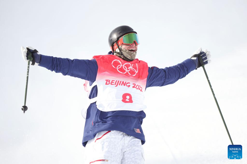 David Wise of the United States reacts during the freestyle skiing men's freeski halfpipe final of Beijing 2022 Winter Olympics at Genting Snow Park in Zhangjiakou, north China's Hebei Province, Feb. 19, 2022. (Xinhua/Xue Yubin)