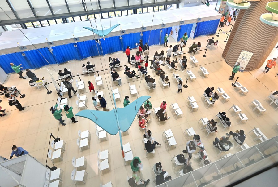 Children wait with their parents to receive COVID-19 vaccines at a community vaccination center for children in Hong Kong, south China, Feb. 16, 2022. (Xinhua)