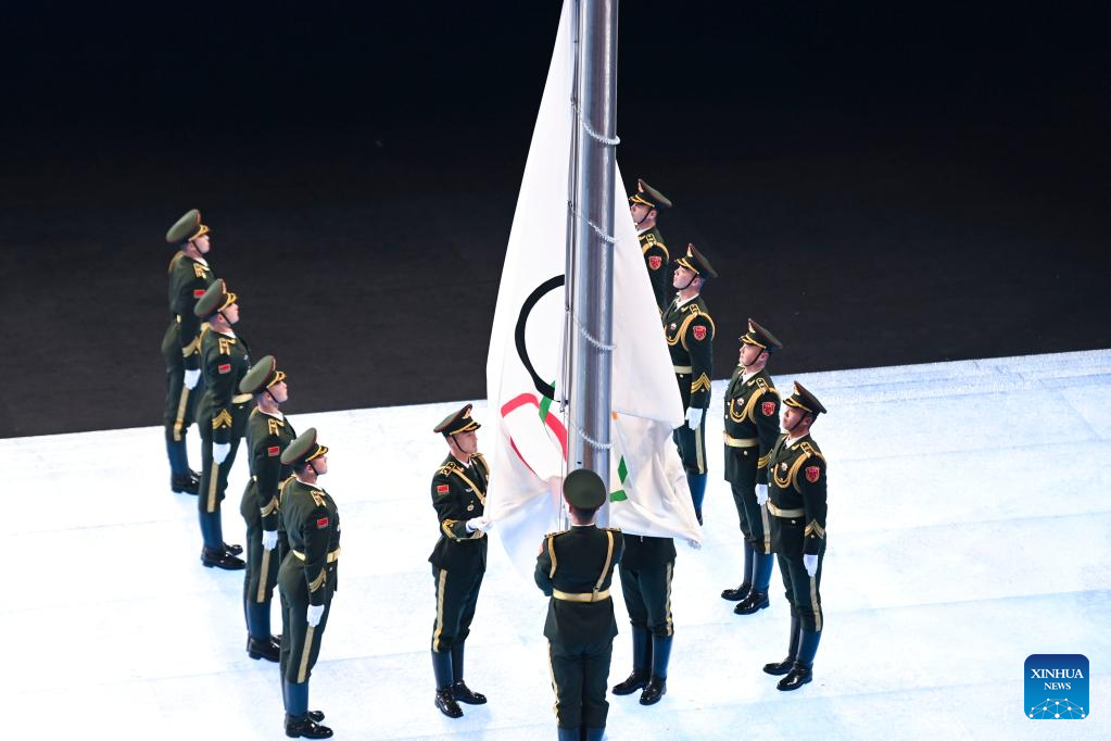 The Olympic flag is lowered during the closing ceremony of the Beijing 2022 Olympic Winter Games at the National Stadium in Beijing, capital of China. (Xinhua/Xu Zijian)