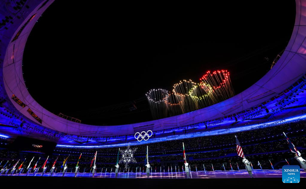 Fireworks illuminate the night sky during the closing ceremony of the Beijing 2022 Olympic Winter Games at the National Stadium in Beijing, capital of China, Feb. 20, 2022. (Xinhua/Li Ga)