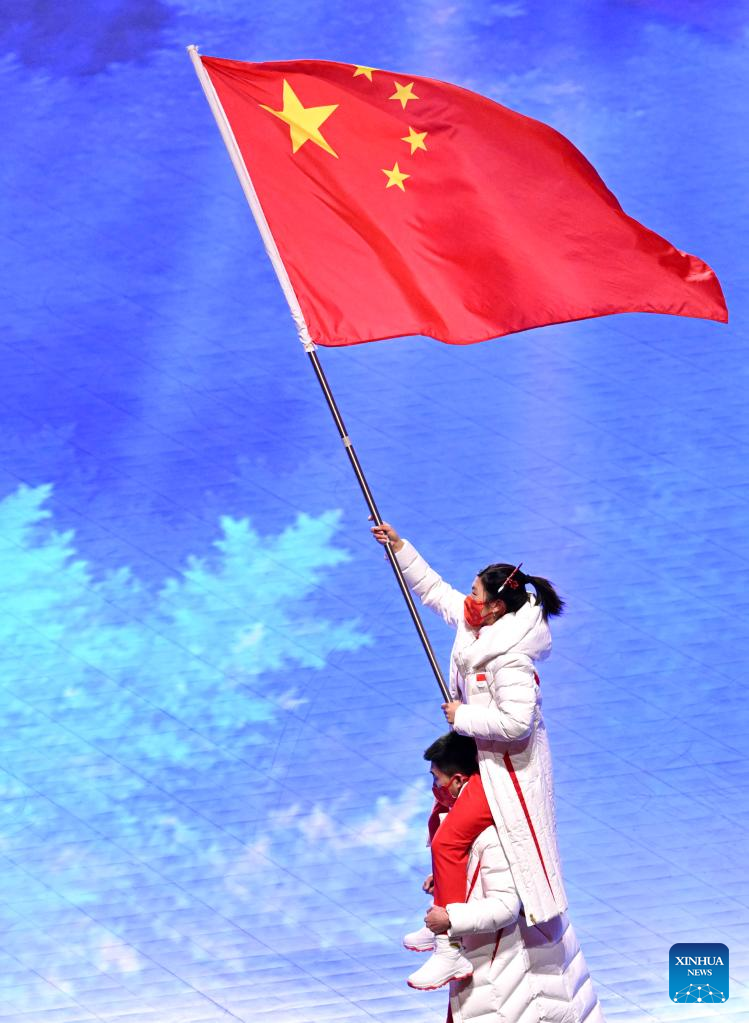 Xu Mengtao (top) and Gao Tingyu, flag bearers of the Olympic delegation of the People's Republic of China parade during the closing ceremony of the 24th Olympic Winter Games at the National Stadium in Beijing, capital of China, Feb. 20, 2022. (Xinhua/Du Yu)