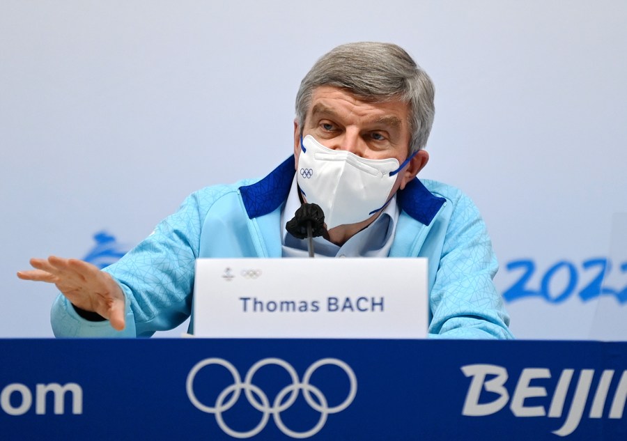 International Olympic Committee president Thomas Bach speaks during a press conference at the Main Media Center for Beijing 2022 on Feb. 18, 2022. (Xinhua/Li Yibo)